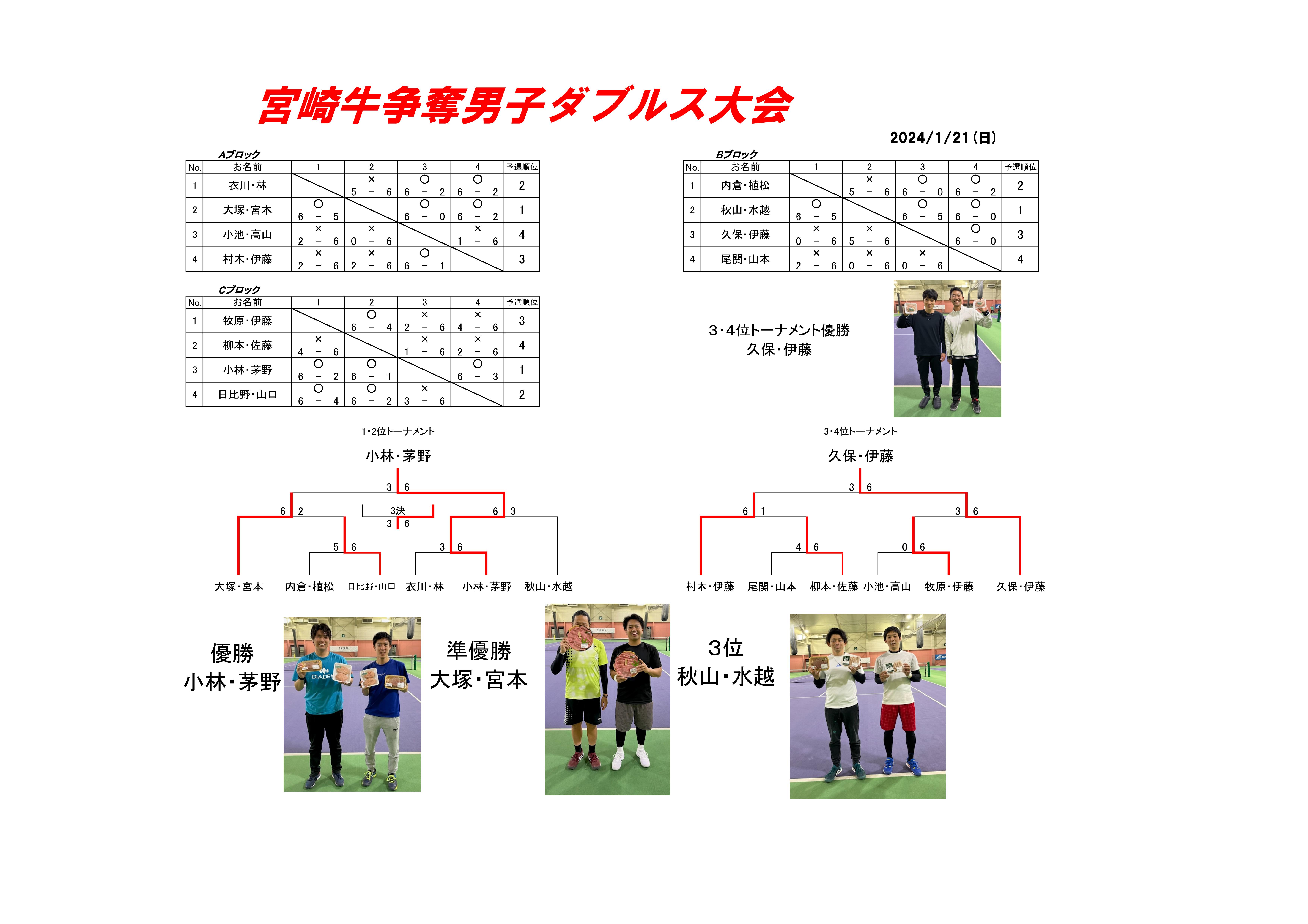 イベント&新着情報 1/21(日)宮崎牛争奪戦オープンダブルス大会 結果 2024年01月22日 « 2024年 新クラス開講! 親子でテニスができる!❝ファミリークラス❞ 2/4(日)初中級オープン男子ダブルス大会結果 »
